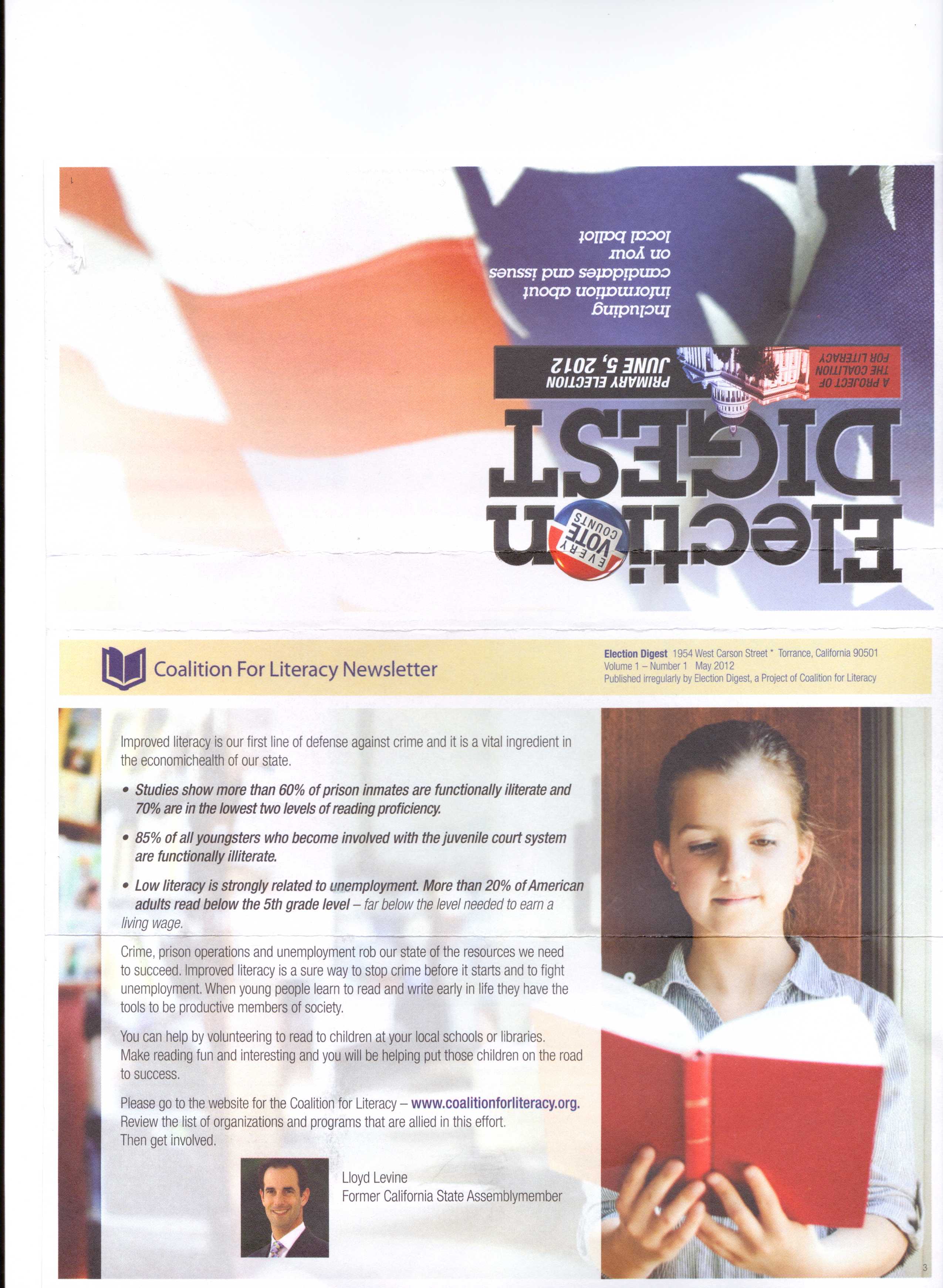 There is a piece of mail called the Coalition for Literacy Newsletter with Lloyd Levine on it in all his glory.