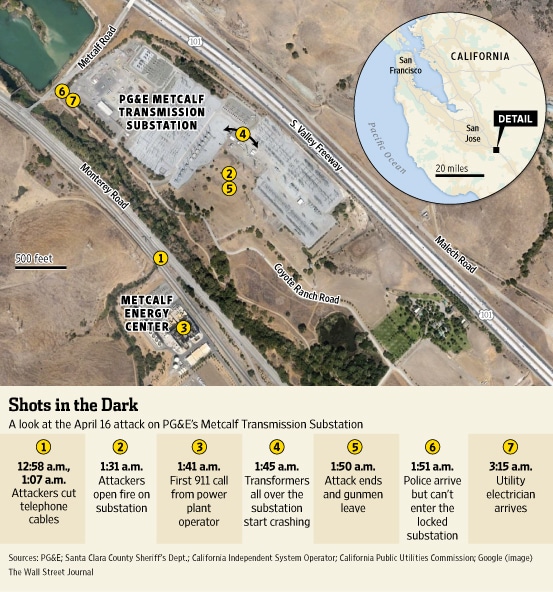 At 12:58 a.m., AT&T fiber-optic telecommunications cables were cut—in a way that made them hard to repair—in an underground vault near the substation, not far from U.S. Highway 101 just outside south San Jose. It would have taken more than one person to lift the metal vault cover, said people who visited the site.