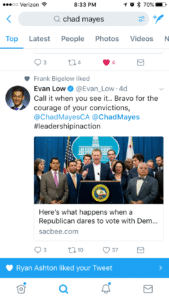 Frank Bigelow (AD05): See the embedded screenshot of him liking a tweet by democrat Phil Ting extolling the virtues of the Cap and Trade agreement. He also retweeted Henry T Perea’s tweet of the SacBee Article. It appears a safe conclusion that Mr. Bigelow was a yes vote and voted no in order to avoid a lynch mob in his own district.
