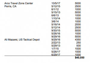 Mazarei has written Stan Sniff checks totaling $40,500. We believe (Not) coincidentally, he is one of the just over 2000 CCW permit holders in Riverside County. (A county of 2.4 Million people) Since it is in doubt the circumstances surrounding the original issuance of the CCW, it is also a very valid question to ask if that financial largess had anything to do with the 4 renewals that have occurred within the time frame of his donations to the Sheriff. Again, according to Mazarei and his attorney there is no connection between his donations and any special treatment by the sheriff.