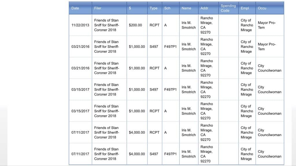 It looks like Iris is a a $6,200 donor to the Sheriff. It makes you wonder if the “Endorsement” and autograph from the Sheriff is connected to the money. Ahem, it would not be the first time there were donations coupled with action in the Sniff Regime.