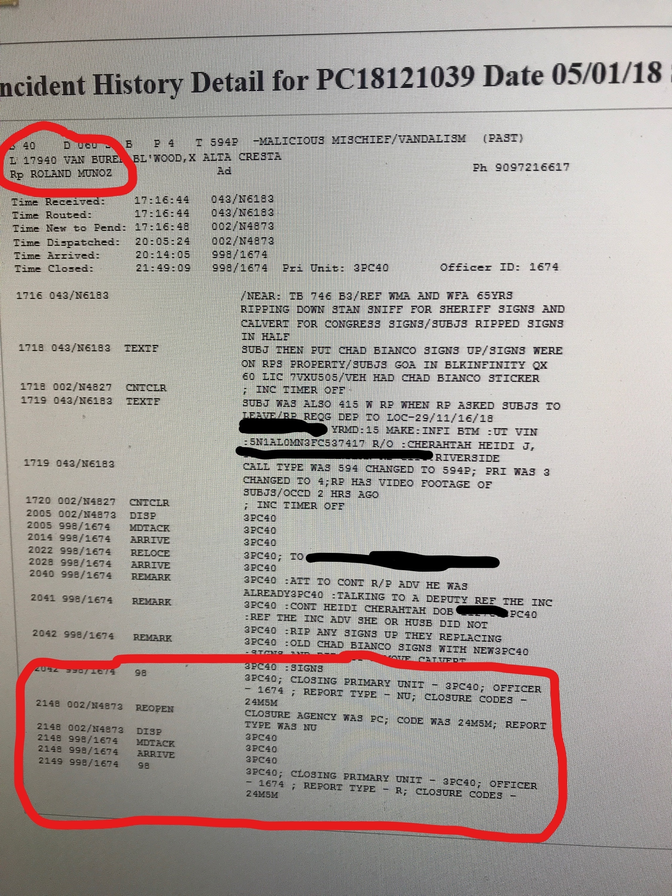 Note that the badge number of this deputy is 1674 – this is clearly someone with 30 years of experience that responded to the case. This means that the Sheriff / his minions overrode a deputy with 30 years of experience and made him file a report. This is called playing politics with police work.