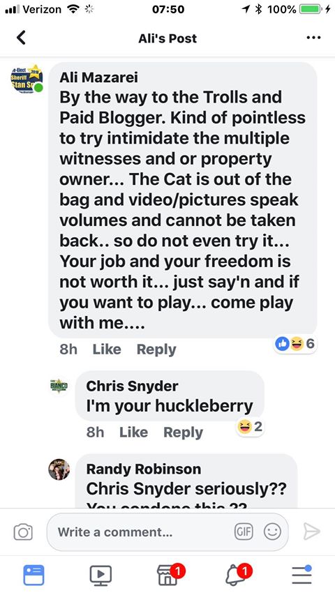 Ali…you’re hilarious with your taunts. Just like the bully you are, all bark and no bite. “You wanna play?” REALLY?!?! Can’t you see you’re on the losing team? Can’t you see soon you will be an ordinary citizen with no CCW, no sheriff in your back pocket, and a business that will be covered with a shame cloud?