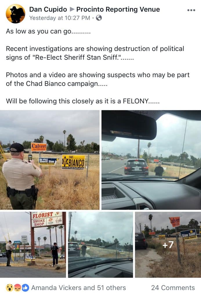 The sign war has been engaged for a while, I’ve been made aware that 500+ Chad Bianco Signs have disappeared. Not sure how many of Sniff’s