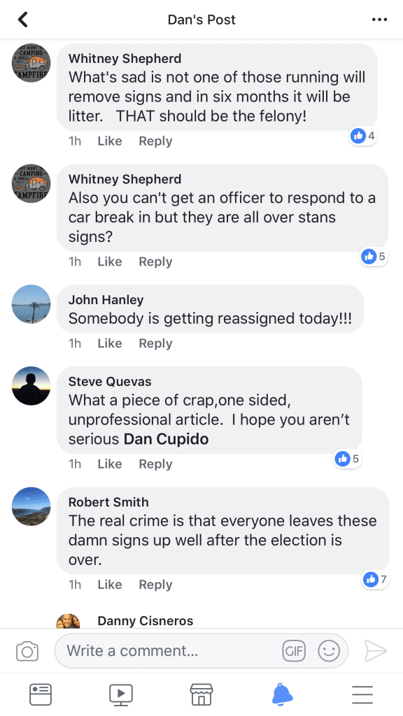 Lastly and most importantly – see the comment from a Whitney Shephard – “You Can’t get an officer to respond to a car break in, but they are all over Stan’s signs?”