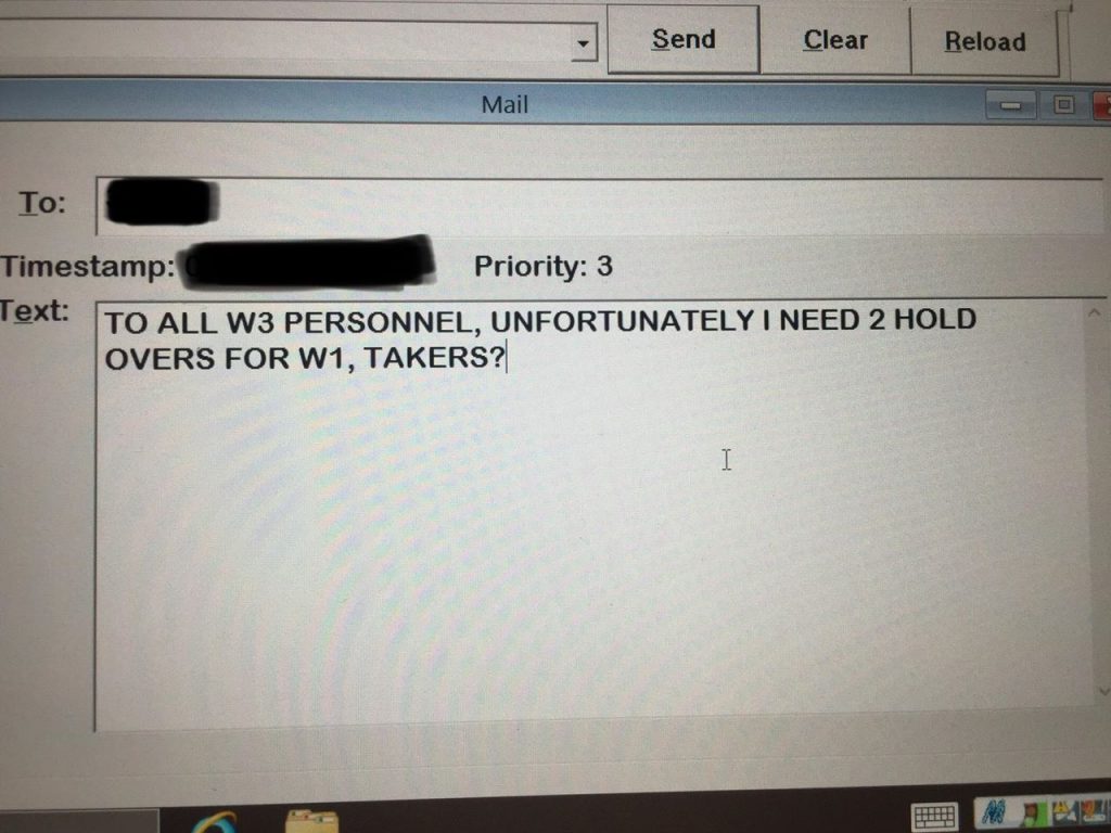 This just happened. The attached MDC mail was sent by a graveyard sergeant to the on-duty swing shift deputies at (XXX) station looking for two deputies to hold over until 5am. Apparently no one replied. A few minutes later, the dispatcher is asking for two deputies to hold over. Again, no reply. Then a second plea via MDC mail was sent by the sergeant asking again for 2 deputies to stay over to cover graves. You would think the lack of responses would be a hint we don’t want to hold over. We’re tired. We get this request almost every night. This is another example of the current atmosphere at (XXX). Burnt out deputies being overworked every day of the week. I guarantee the sergeant will volunteer some tired, exhausted Deputy to hold over. Hope it’s not me.
