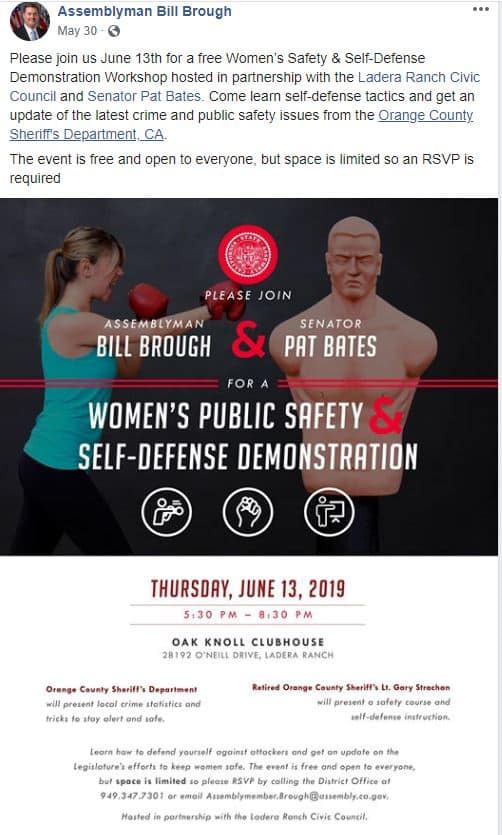 Below is a sick, sad Irony from Bill Brough’s Facebook page – sponsoring an event for Women with Senator Pat Bates. Women’s Safety and Self-Defense. Imagine that.