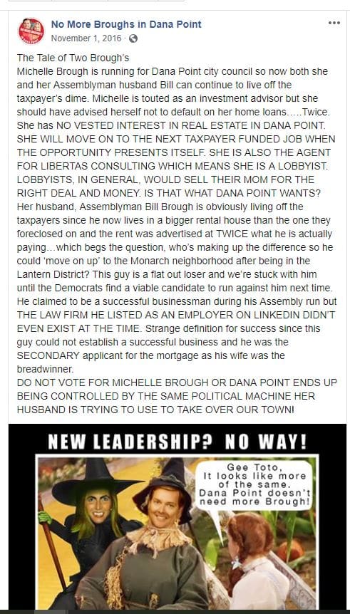 If I lived in Orange County, I’d have probably known that Michelle Brough has been Bill Brough’s “partner in crime” all along. If you listen to the toll road nimby’s from San Clemente, your intrepid blogger is part of a plot. If I was part of some conspiracy on behalf of the toll road people, I should have known that Michelle Brough ran for City Council in 2016. Until 3 days ago, I did not. (If you can convince any of the crazed Toll Road opponents otherwise, you should get a PHD in psychology…)