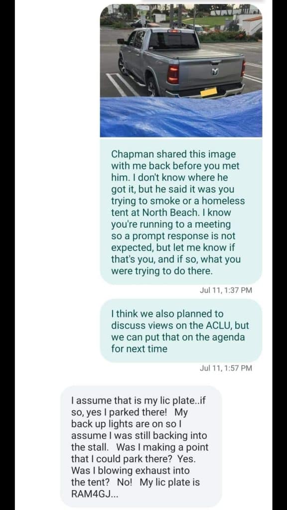 The embedded Text thread is related to an allegation that Gene James backed his truck in to a parking stall near a former homeless encampment location and was blowing exhaust in to one of the tents. The allegations against Gene James are many. I have additional text message threads and screenshots from Facebook Groups in San Clemente celebrating the harassment of the homeless. I also have a video interview of two of Gene James’ victims, plus videos of even more. At the request of the source, I am holding off publishing them until the people in them give their consent. Suffice to say, Gene James is in most all of the videos doing what he does best – bullying and harassing people.