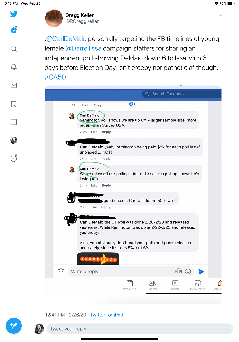 Carl DeMaio in the tail end of a multi-million dollar campaign is on facebook trolling staff of Darrell Issa. What an undisciplined trainwreck. However, this is consistent with his pattern and drama. Also – it has been put to me that Carl DeMaio in one of his many outbursts has told people that if he … Continue reading CA-50 Update: Carl DeMaio is coming apart at the seams late in a campaign again. Also, has said in private conversations he is leaving the GOP