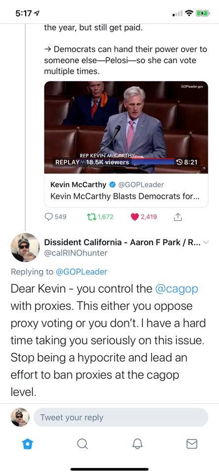 Irony Alert: 44% of current CAGOP Chair Jessica Patterson’s Votes were Via Proxy. Kevin McCarthy actively solicits proxy votes before every CAGOP Convention. Now this: