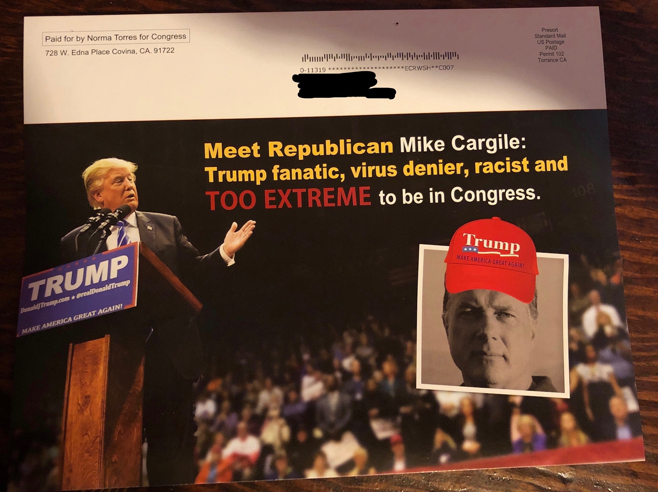 Well these people all look like fools – one, they told us we needed Republicans in every race to make the democrats spend money so they would have less to chase targeted races. So Mike Cargile is doing just that – the Communist Sympathizer Norma Torres (who hails from the birthplace of MS-13) attacked Cargile in the mail: