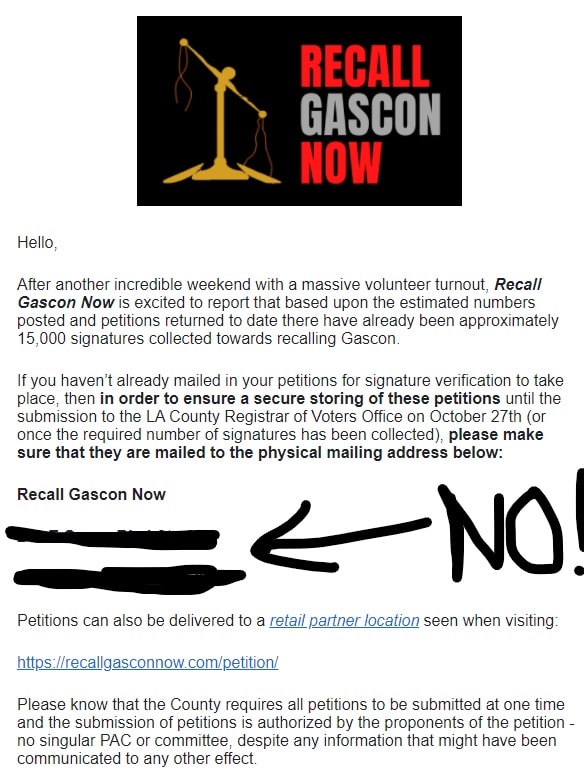 The proponents of this effort literally need 580,000 +/- Valid Signatures to put George Gascon on the ballot and they only have 145ish days left to do it! Why is this other group out there complicating the effort? The one accurate representation from the email is that LA County demands all signatures to be delivered at once, further protecting corrupt incumbents and complicating efforts. This puts an exclamation point on the fact they are telling people to send their stuff to another address.
